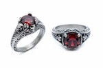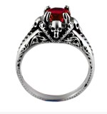 Ladies Red Solitaire Filigree Skull Ring Lady Biker Stainless Steel Sizes 5 - 10 The Ladies’ Red Solitaire Filigree Skull Ring Features a Striking Red CZ Stone in a Solitaire Setting, with Intricate Filigree Dancing around Skulls on all Four Sides and a Touch of Black Antiquing for that Perfect “Classy, but I Bite” Edge. Crafted from Stainless Steel, it’s Built to Last as Fiercely as your Inner Rebel.